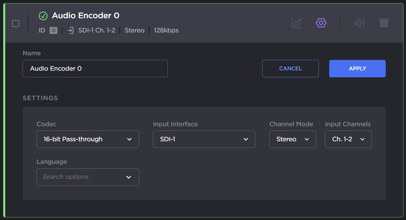 To connect this audio encoder to a stream, see Setting Up Streams.