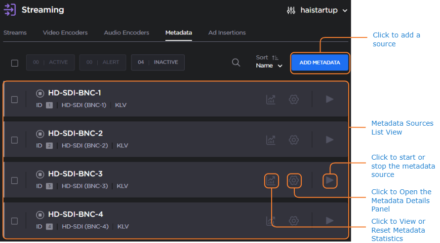 The Metadata List View opens, displaying the list of defined Metadata sources for the encoder. Four KLV metadata sources are provided by default (either HD-SDI or ST 2110 input, depending on the encoder Personality).The Metadata List View displays the Status, source Name, Type, Format, and selected Parameters for each source.