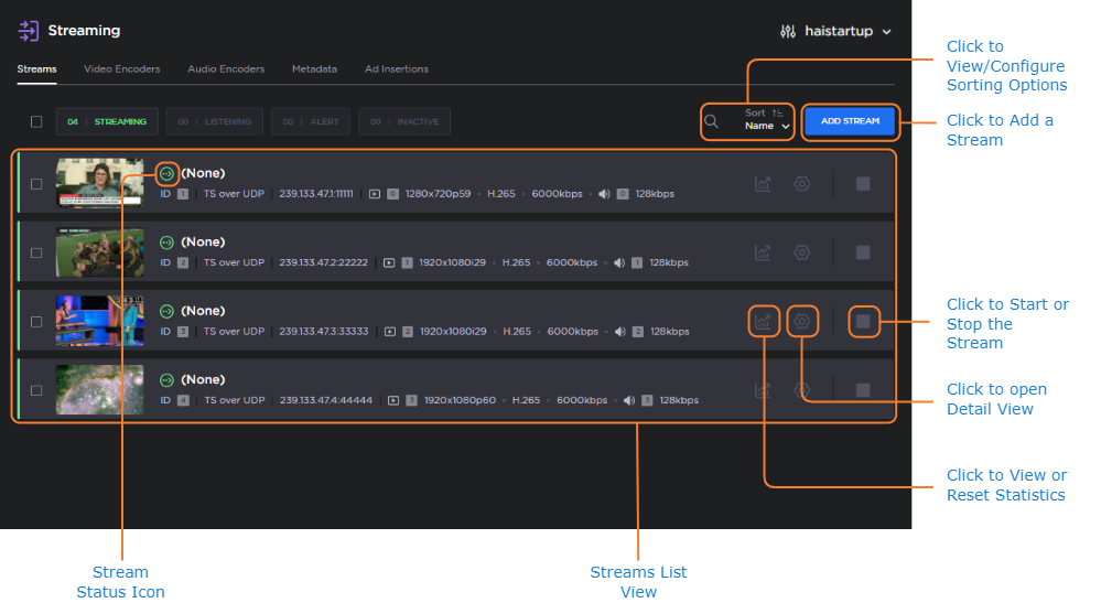 to start or stop the stream.Click the Sort dropdown to sort the streams by Ascending or Descending order, and/or by ID, Name, Destination IP, Protocol, or Status.