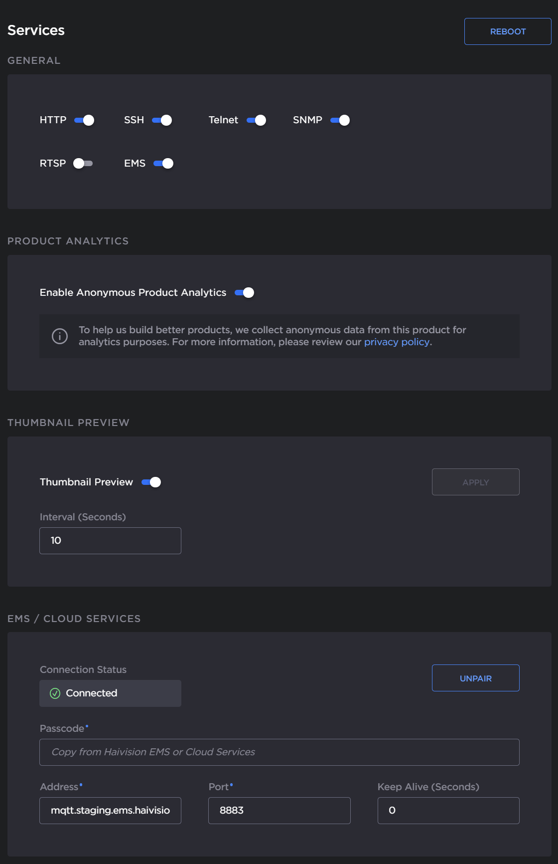 To pair the encoder with Haivision EMS or Hub 360, toggle EMS on and configure the EMS/Cloud Services section.