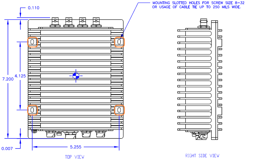 Or you can use two stainless steel, harsh-environment cable ties (up to 250 mils wide), which can be passed through slots in the chassis. The following drawing highlights the four slots for fastening the unit with screws or cable ties. The dimensions shown are in inches.