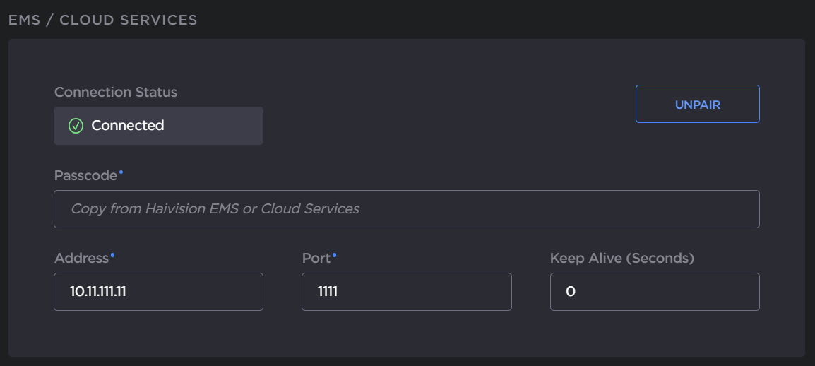 On the EMS/Cloud Services panel, enter the passcode (copied and pasted from Haivision EMS).