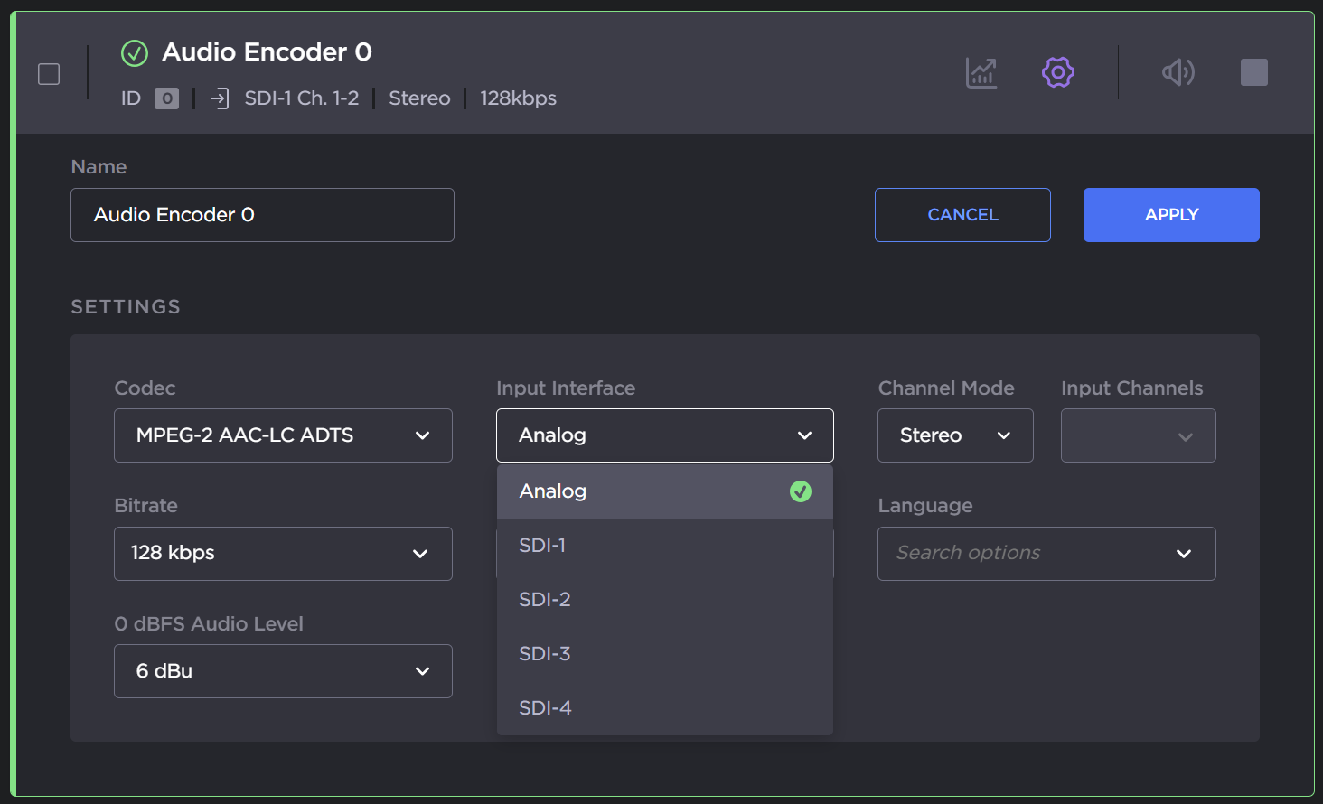 on the encoder panel to open the Audio Encoder Detail View.Select Analog for the Input Interface.