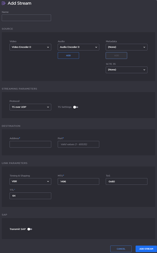 To add an output stream, click the Add Stream button. The Add Stream page opens.