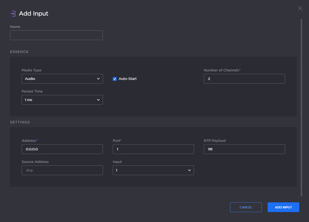 From the Input Essence Detail View, you can create and configure ST 2110 media essence inputs. For each input, you need to select the Media Type – either video, audio or ancillary data – as well as the Input number (1...4). The encoder supports running four (4) inputs of each Media Type at the same time.