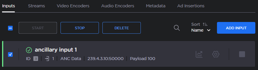 To start or stop the input, check the checkbox of the selected input and click Start or Stop, or click the Start/Stop icon