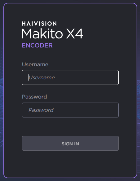 Please refer to the Important Notice (postcard shipped with the appliance or available from the Download Center on the Haivision Support Portal) for the default sign-in credentials.