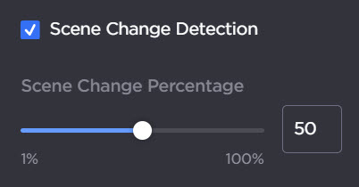 Scene Change Detection | Disabled | Check this checkbox to enable scene change detection. When enabled, this feature automatically detects significant scene changes in the source video and generates an I-Frame to reduce trailing artifacts. The scene change percentage (i.e. the percentage of the video image that needs to change in order for the encoder to detect a change of scene and generate an I-frame) is set to 50% by default, and can be altered using the slider. ![]() |