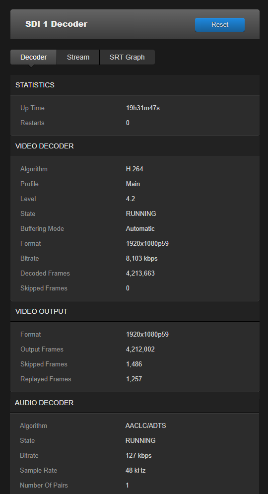 SDI 1 showing Input Stream Data
