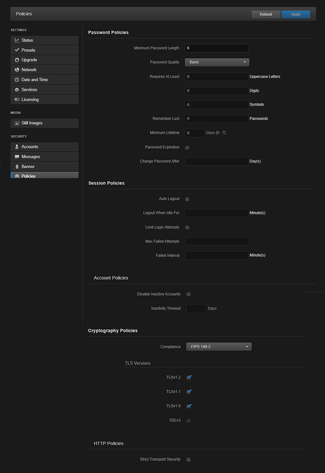 From the Policies page, administrators can set policies for passwords, session timeout, cryptographic strength, and other security criteria for Makito X user accounts. These policies will apply to all user accounts; therefore, it is recommended to set the policies before beginning to create accounts.