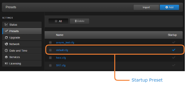 On the Administration page, click Presets on the sidebar (under Settings). The Presets List View opens displaying the list of saved presets for the decoder. The startup preset is indicated with a blue check.