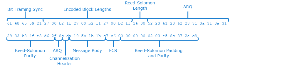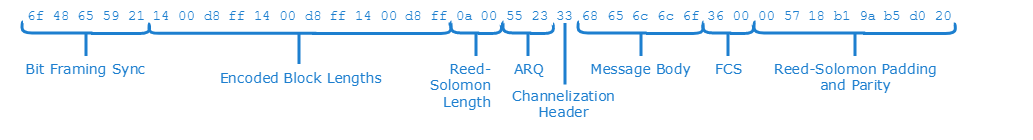 Note that due to the fact that the Reed-Solomon block size is 155 bits, which is 19.375 bytes, the coloring of individual bytes beyond the first block is approximate, as individual message bytes may contain bits from two separate layers. Individual codewords are not padded out to be an integer number of bytes; only the last codeword is padded so that the overall message occupies an integer number of bytes. This is why the actual message data in the above example is not recognizable as the ASCII string "hello".