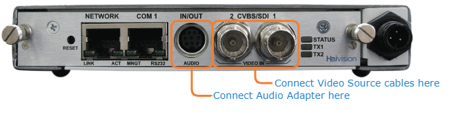 Video In: Connect your Video Source cable(s) to one or both of the encoder's Video Inputs, using the BNC connectors: