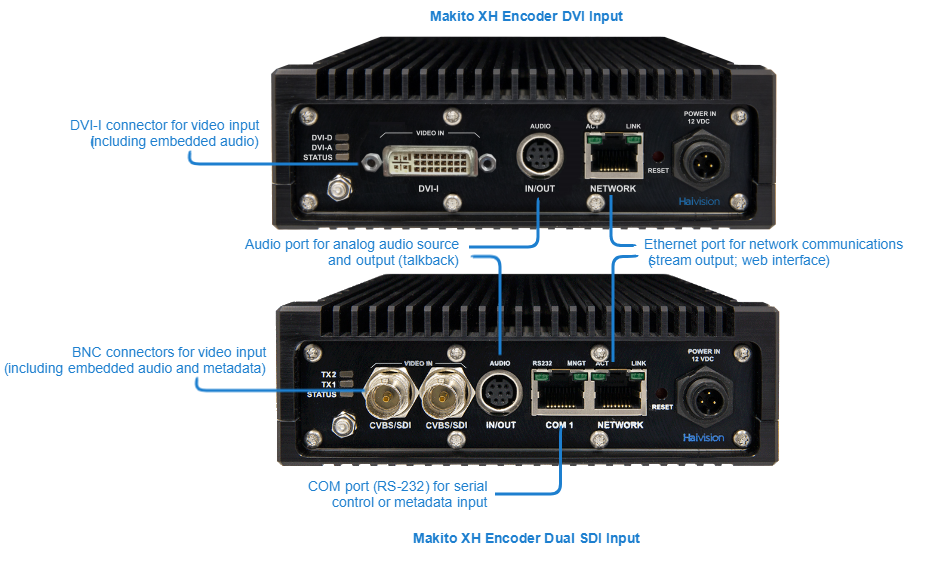 DVI Encoder Input: Connect the Makito XH’s DVI-I Video/Embedded Audio Input to your audio/video source(s) using a DVI-to-DVI or an HDMI-to-DVI cable.3G-SDI Decoder Video Output with Embedded Audio: Connect one or both of the decoder’s SDI outputs to TV or display monitors, using the HD-BNC to BNC Adapter Cable(s) (included in the package for appliances).