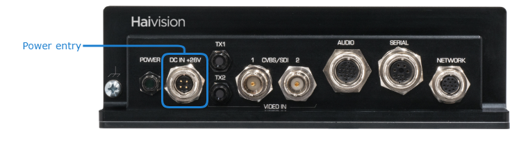 1. Insert the 4-pin connector of the power cable into the power input jack (DC IN) at the rear of the encoder. Both power cables are shipped as part of the Evaluation Kit.