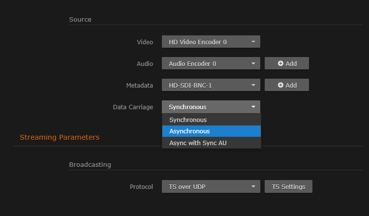 6. To add metadata to the stream, select the Metadata source, and (optionally) select the encapsulation type (Data Carriage).