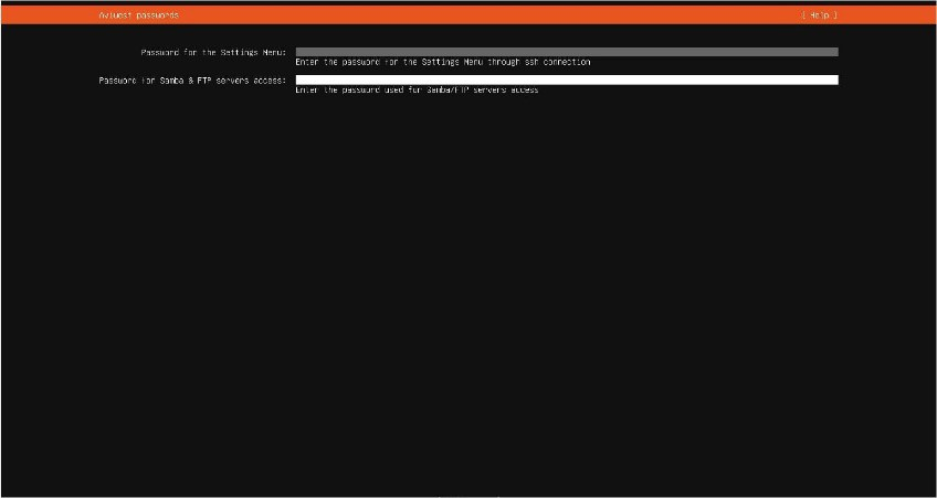 Define access passwords for the SSH settings menu and for FTP/Samba servers as appropriate.