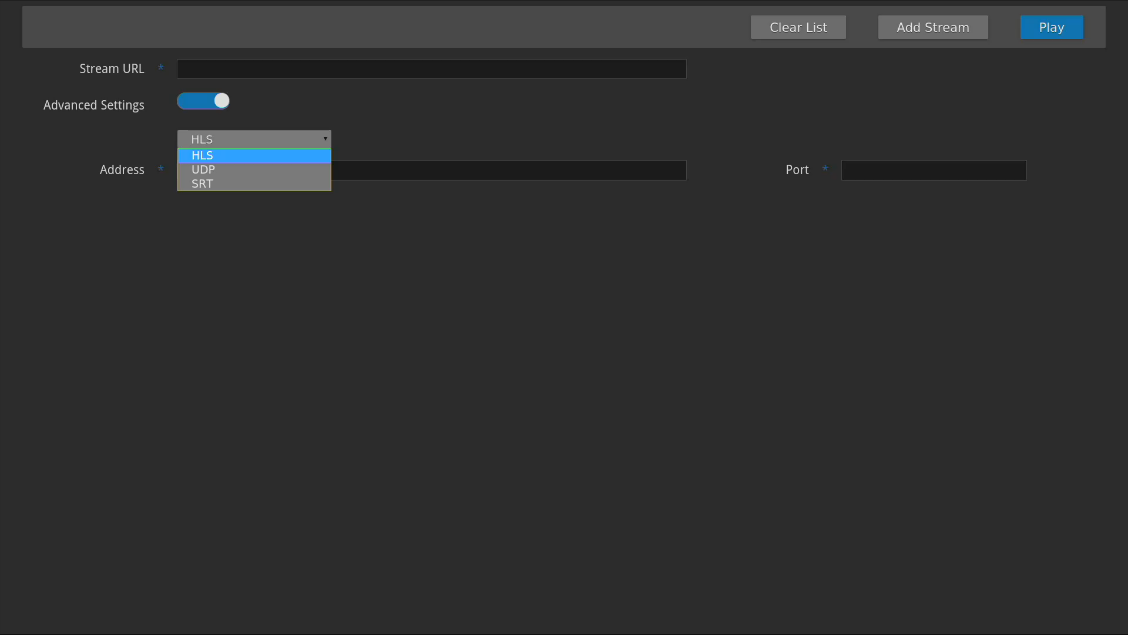 When in Stand Alone mode, you may manually enter URLs to view your SRT, HLS, and UDP video streams. Example video streams you may connect to include: