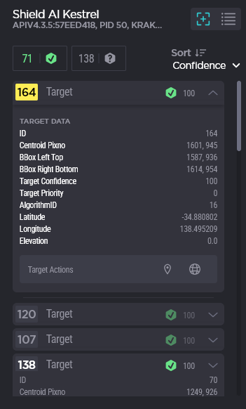 Click the Sort dropdown to sort the Target List by Age, Confidence, or Number in Ascending or Descending order. Note that selecting Confidence will sort the target list by the specified target confidence from the VMTI data’s VTarget pack item targetConfidenceLevel.