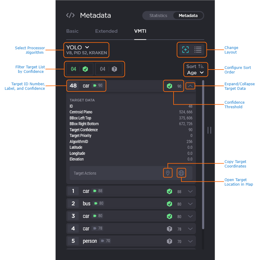 When available, the Metadata tray will open directly to the VMTI data, and display the related processor, target ID number, label, and confidence, as well as a list of the individual target's data.