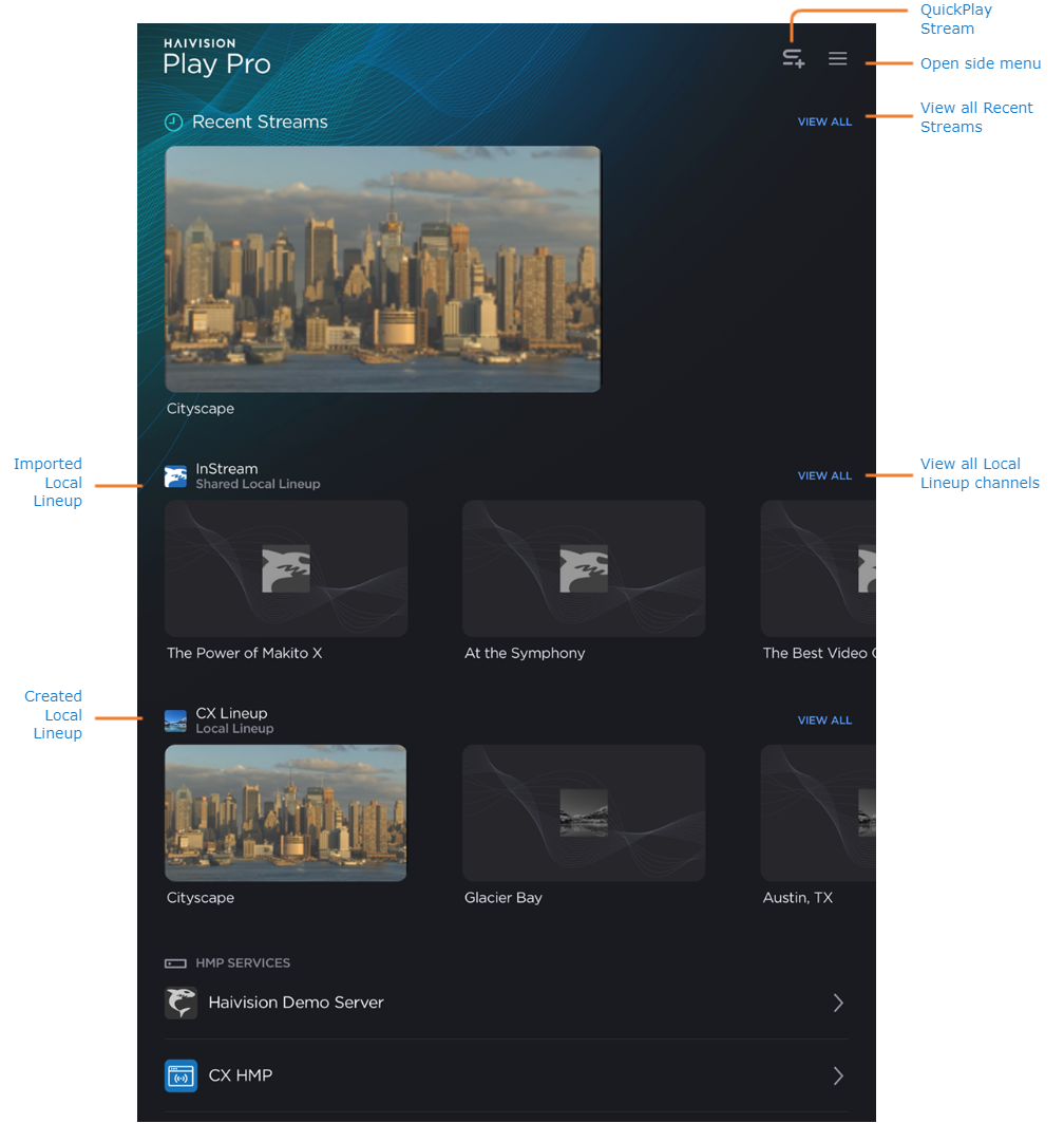 After signing in to Play Pro, you are taken to the Streams screen. From here, you can access the QuickPlay Stream shortcut, recently-opened streams, Local Lineups, and HMP services.