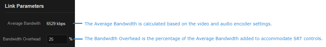 The control packets associated with an SRT stream do, of course, take up some of the available bandwidth, as do any media packet retransmissions. When configuring an SRT stream, you will need to specify a Bandwidth Overhead value to allow for this important factor. The portion of audio and video content in the stream is determined by their respective bit rate settings, which are configured on the audio and video encoders themselves. SRT Bandwidth Overhead is calculated as a percentage of the A/V bit rate, such that the sum of the two represents a threshold bit rate, which is the maximum bandwidth the SRT stream is expected to use.