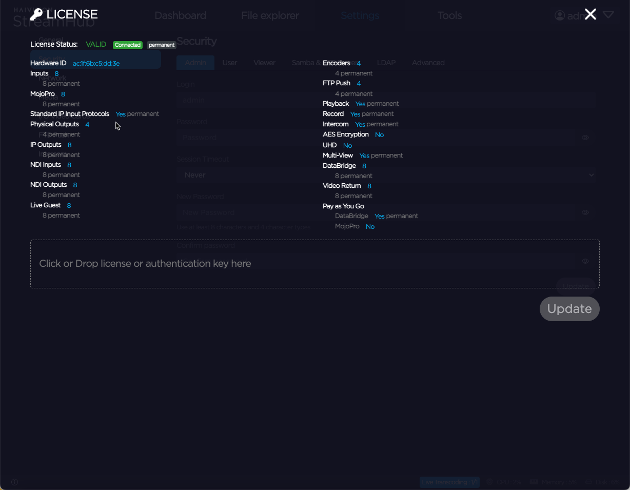 You can easily check the components and options of your StreamHub license from the web interface.