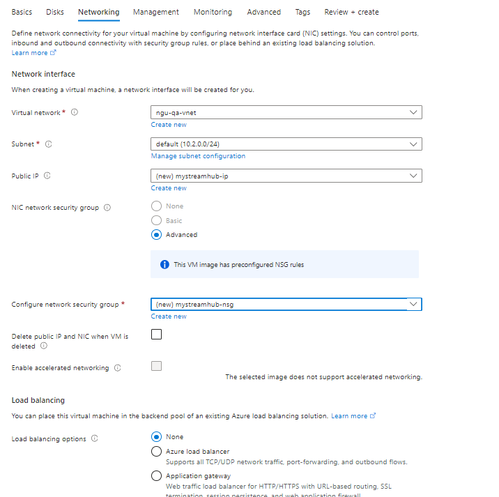 Click Next: Networking. Under Networking interface, specify a virtual network and subnet. Under the Public IP field, click Create new.