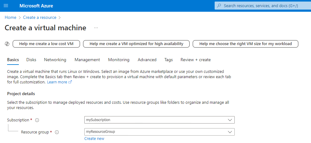 On the Create a virtual machine page, under Basics > Project details, enter your Azure subscription and a valid resource group: