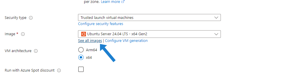Under the Image field, click See all images (this opens a window where you can browse the Azure Marketplace).