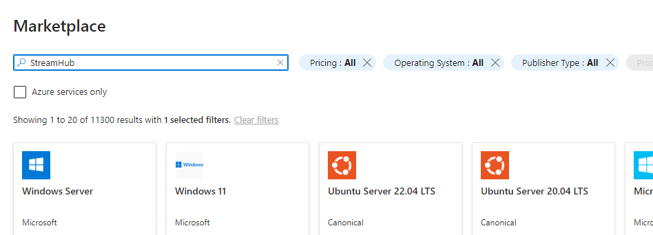 On the Marketplace page, type "StreamHub" in the search field.