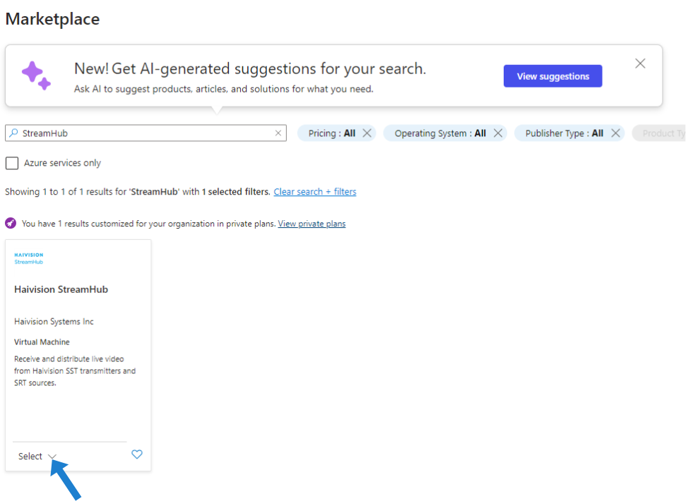 Make sure none of the items in the left panel are selected, then type "StreamHub" in the search box and click Search to find the Haivision StreamHub image.