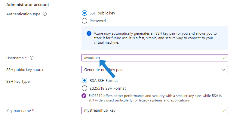 Under Administrator account, select SSH public key and enter awadmin in the Username field: