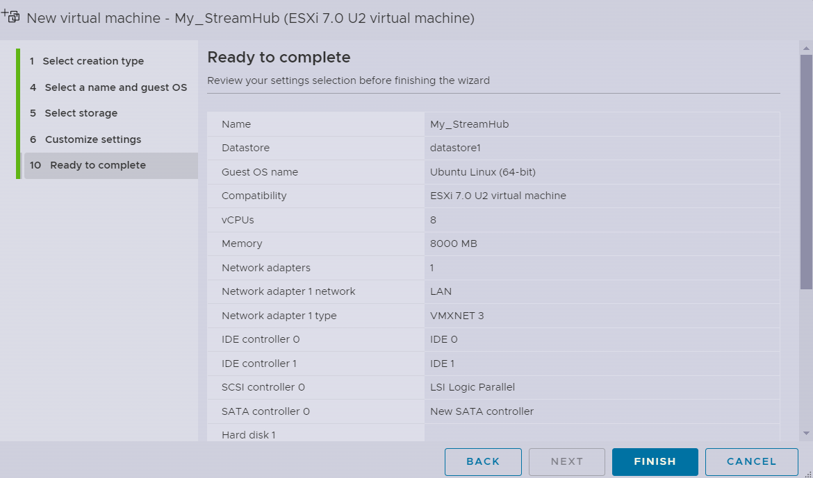 Your virtual machine's settings are summarized. Click FINISH to confirm.