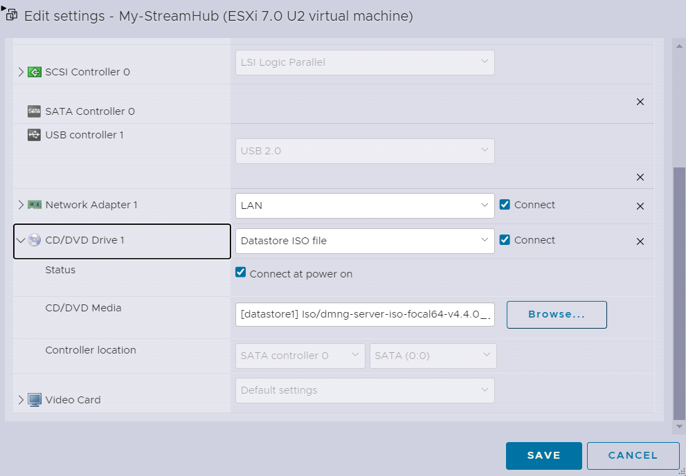 Tick the Connect at power on option and click Browse to get the .ISO file that you downloaded from the Support portal.