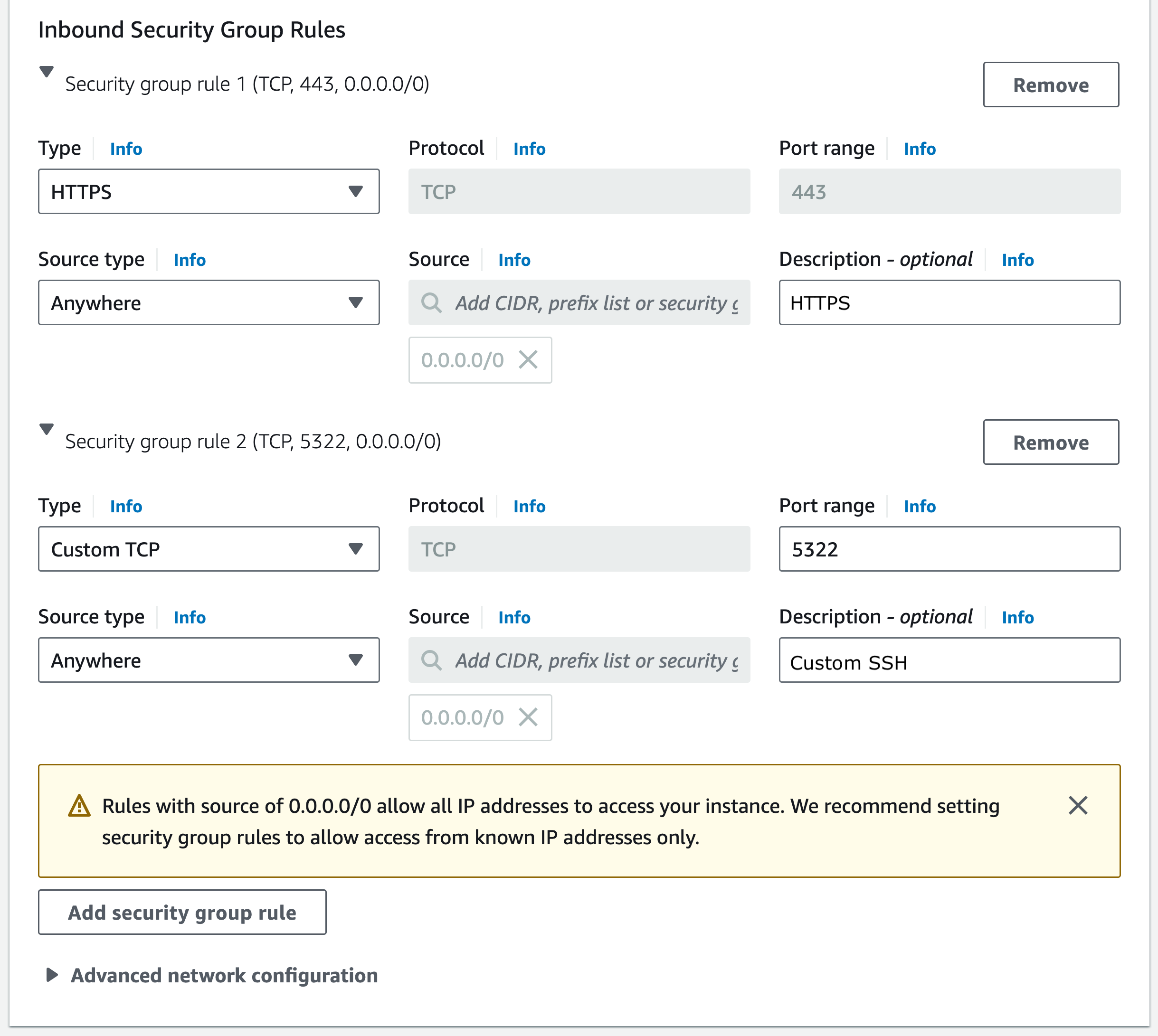 Click Add Rule and add new rule for SSH port 5322 (refer to theNetwork Port Requirements indications):