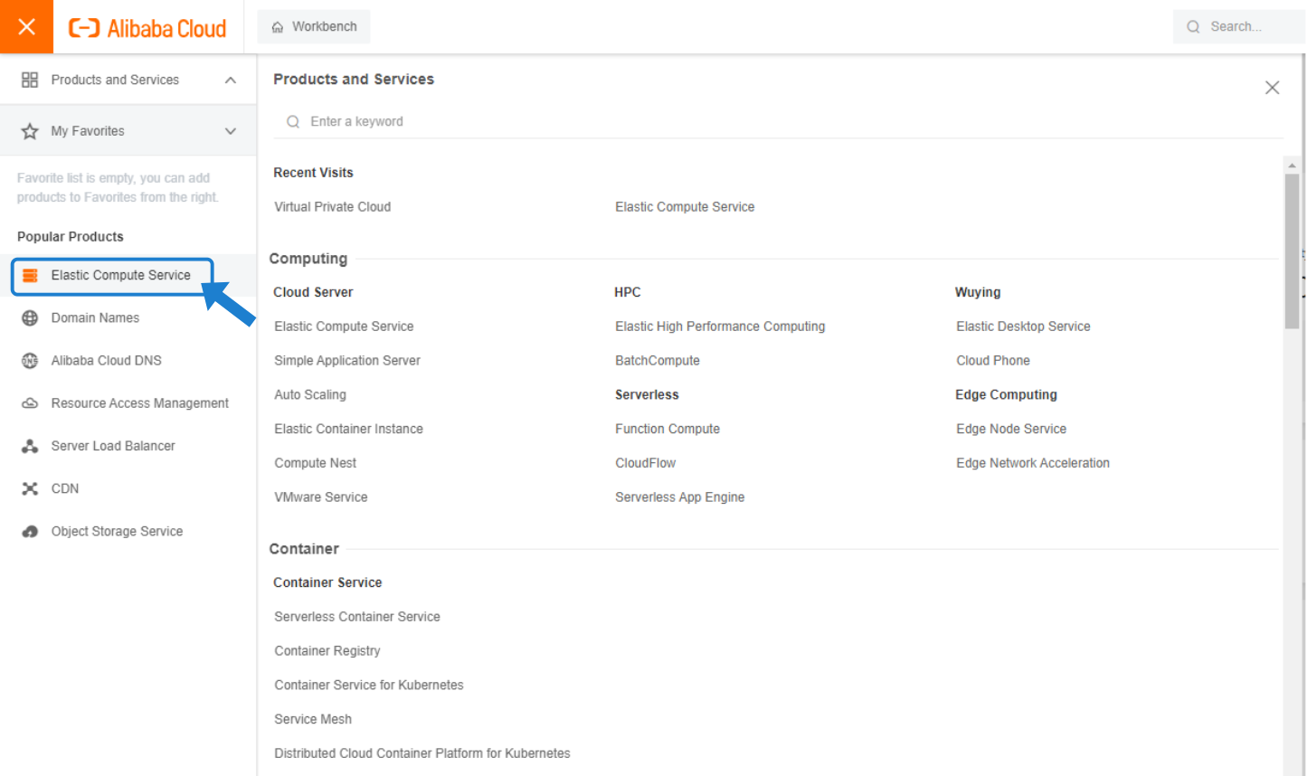 After you have successfully logged in to the Alibaba Cloud portal, click Elastic Compute Service: