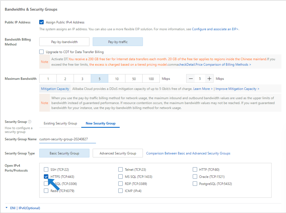 In the Bandwidths & Security Groups section, click Assign Public IPv4 Address.