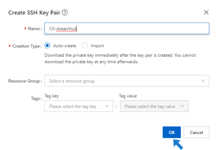 Review your settings. When ready, click Create. You will be prompted to generate a new Public/private key pair:
