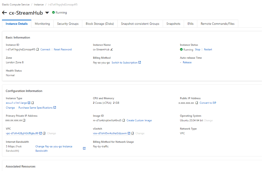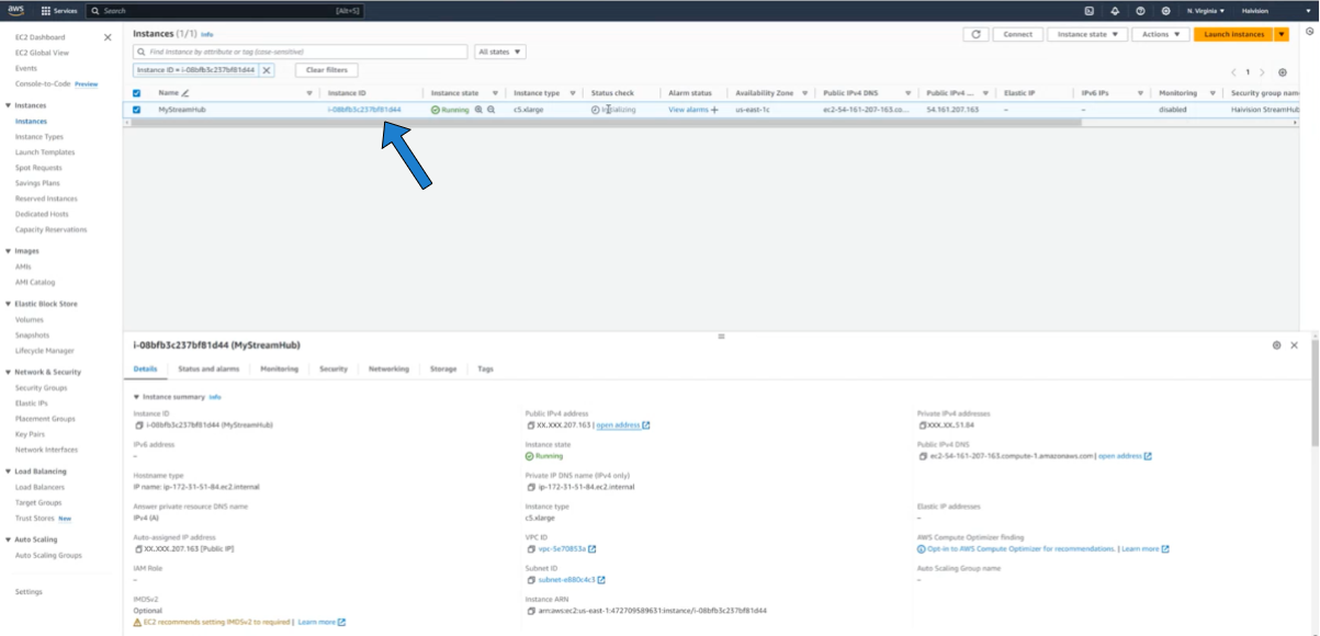 Once the instance has been successfully launched, click on the instance ID to view its properties: