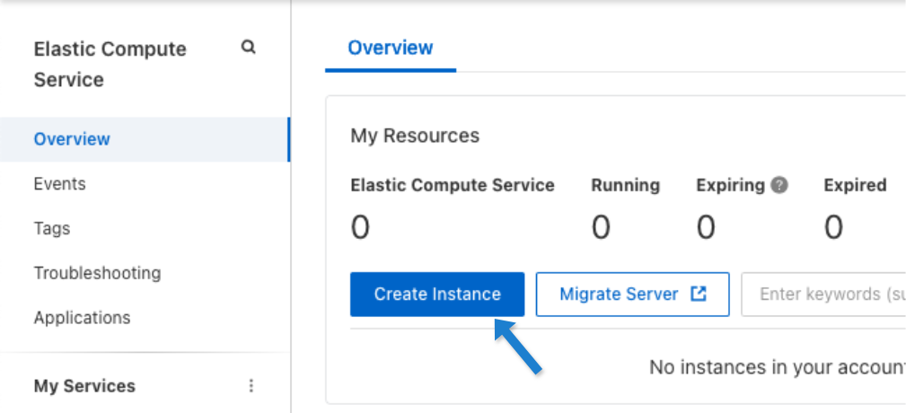 On the Elastic Compute Services (ECS) Overview page, click Create Instance: