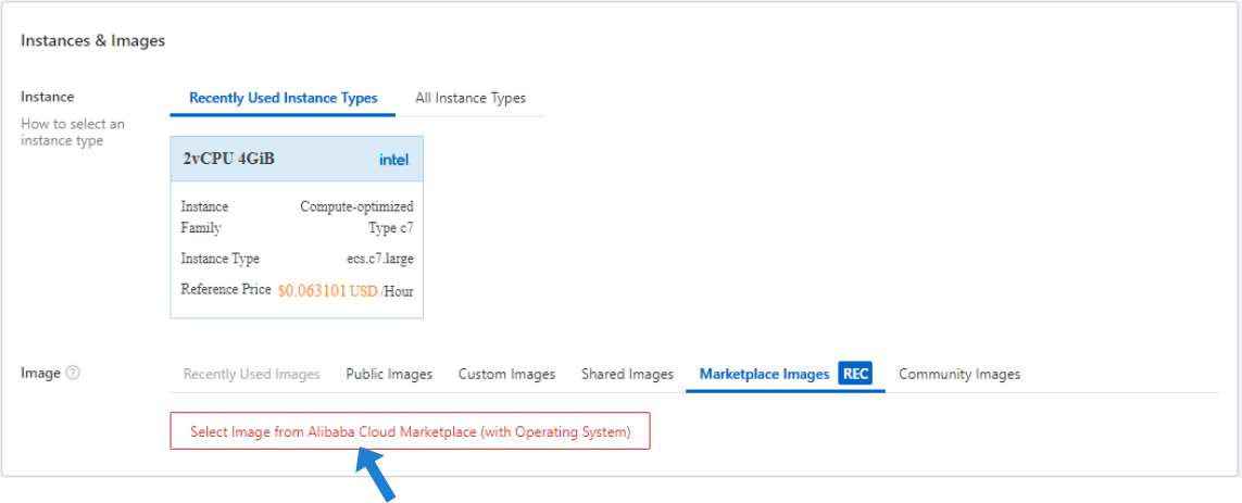 Under Instances & Images section, specify an Instance Type, and then under the Marketplace Images REC tab, click Select Image from Alibaba Cloud Marketplace (with Operating System):