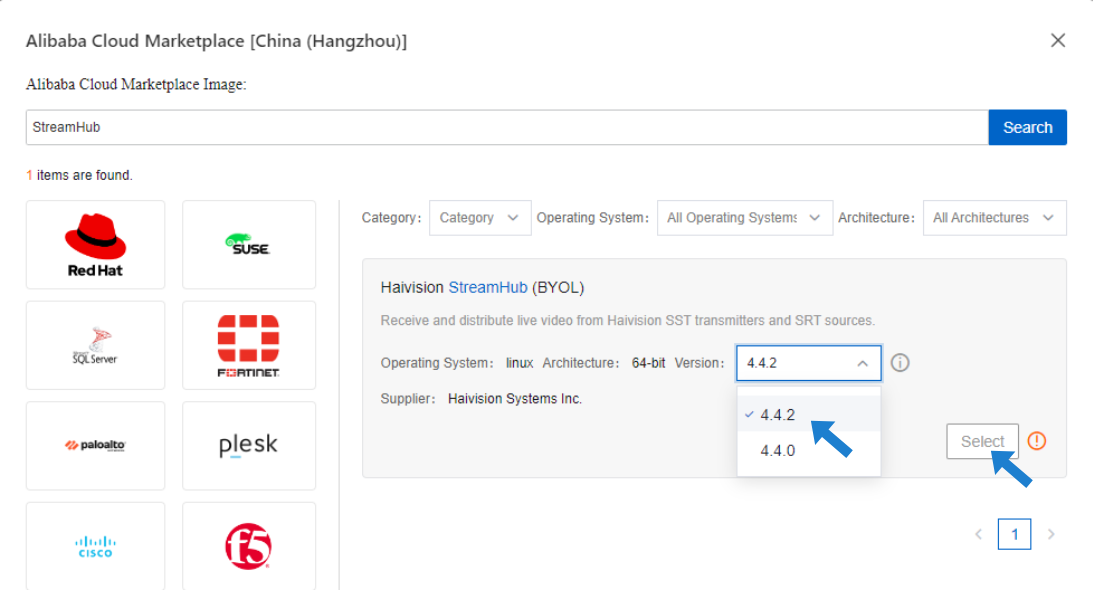 Choose the version of the StreamHub image you wish to use, and then click the Select button.