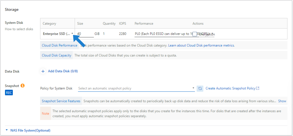 Under Storage, specify the type and size of System Disk you wish to use, and other settings according to your requirements: