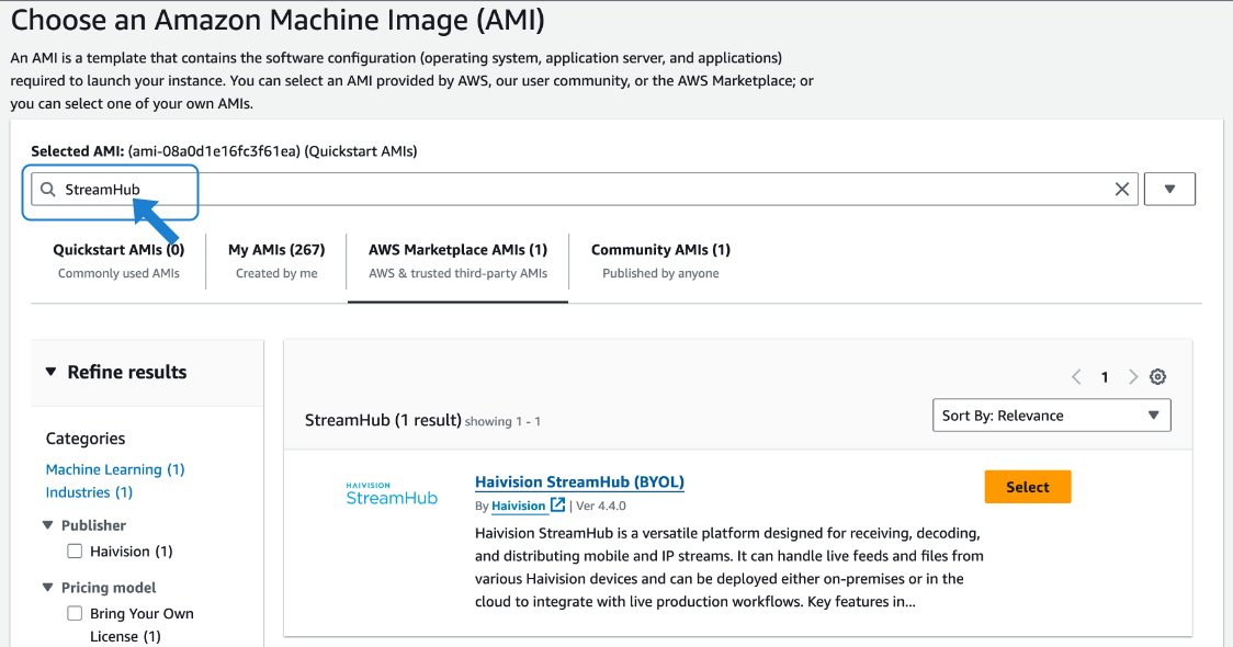 Type "StreamHub" in the search box and press Enter to find the version of the StreamHub Amazon Machine Image (AMI) you wish to use: