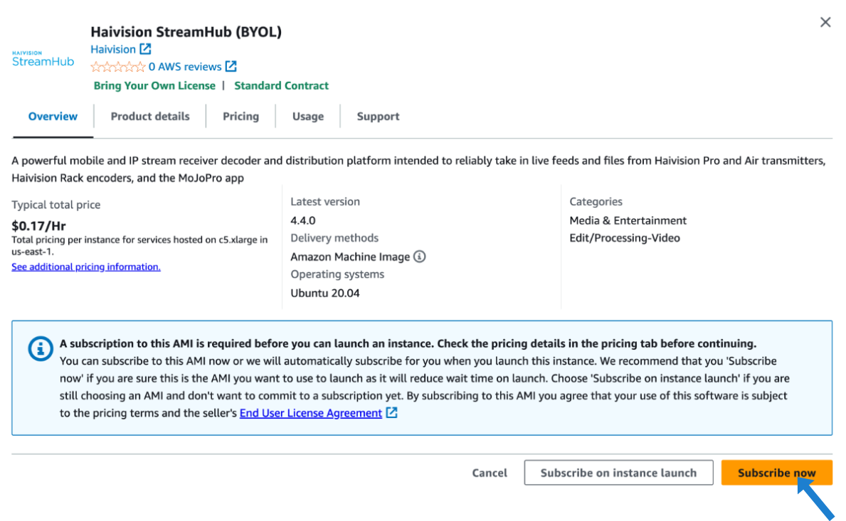 Click the Haivision StreamHub link to review product overview and pricing details, and then click Subscribe now: