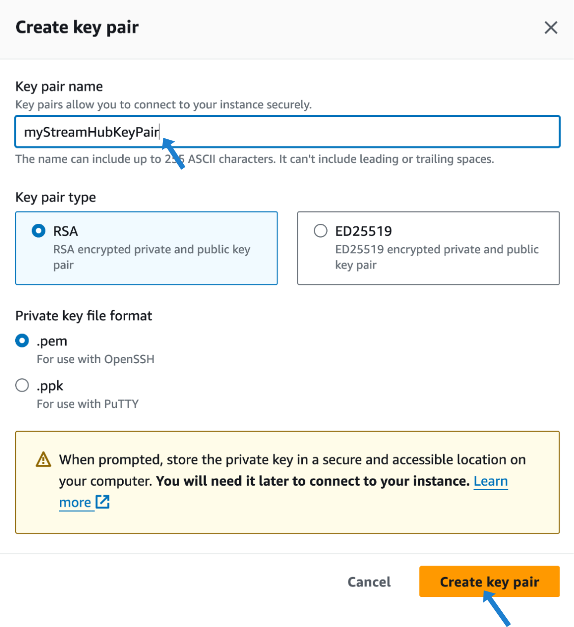 Enter a name for your key pair, and then click OK: