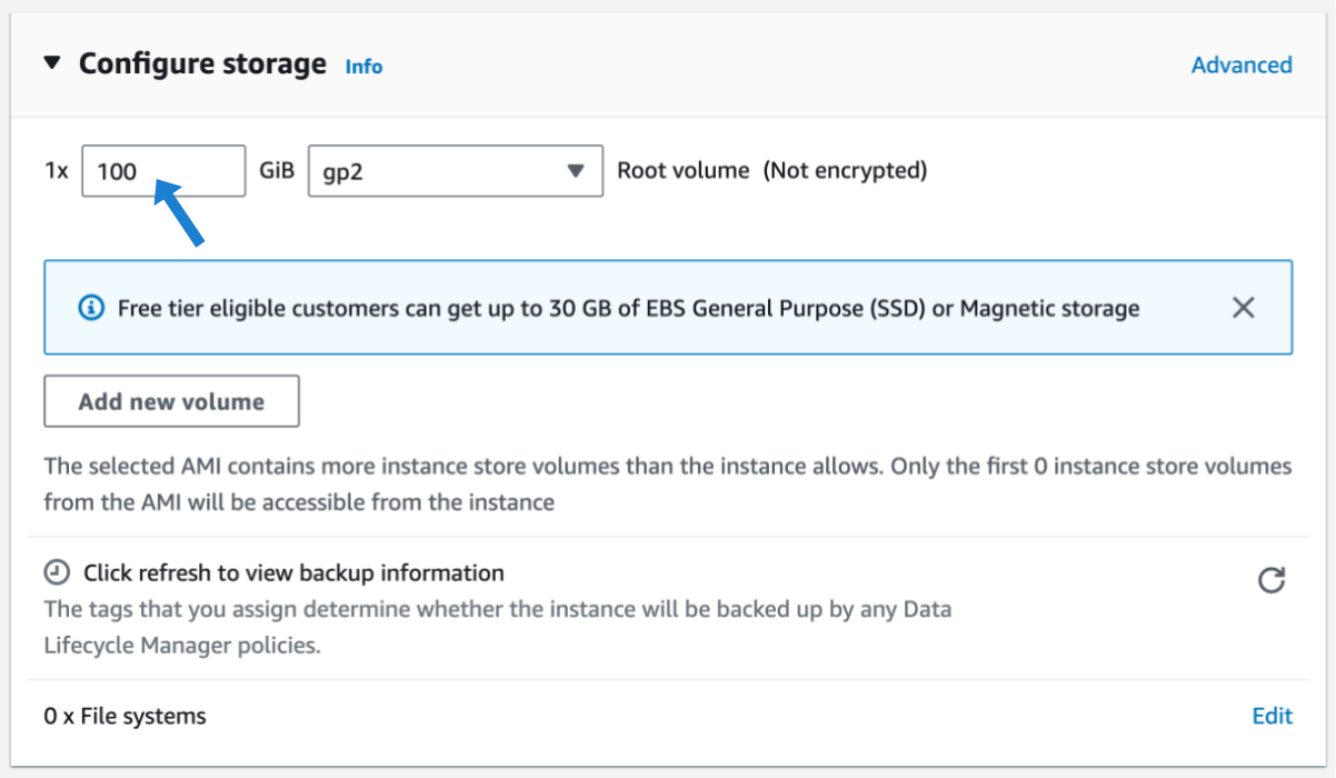 Under Configure storage, adjust the Root volume size according to your requirements: