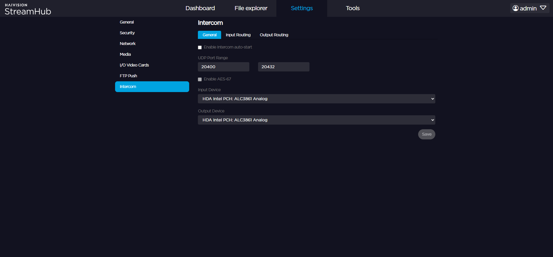 Providing that your license includes the AES67 Intercom option (audio protocol over IP network), you can configure it via the Intercom menu.