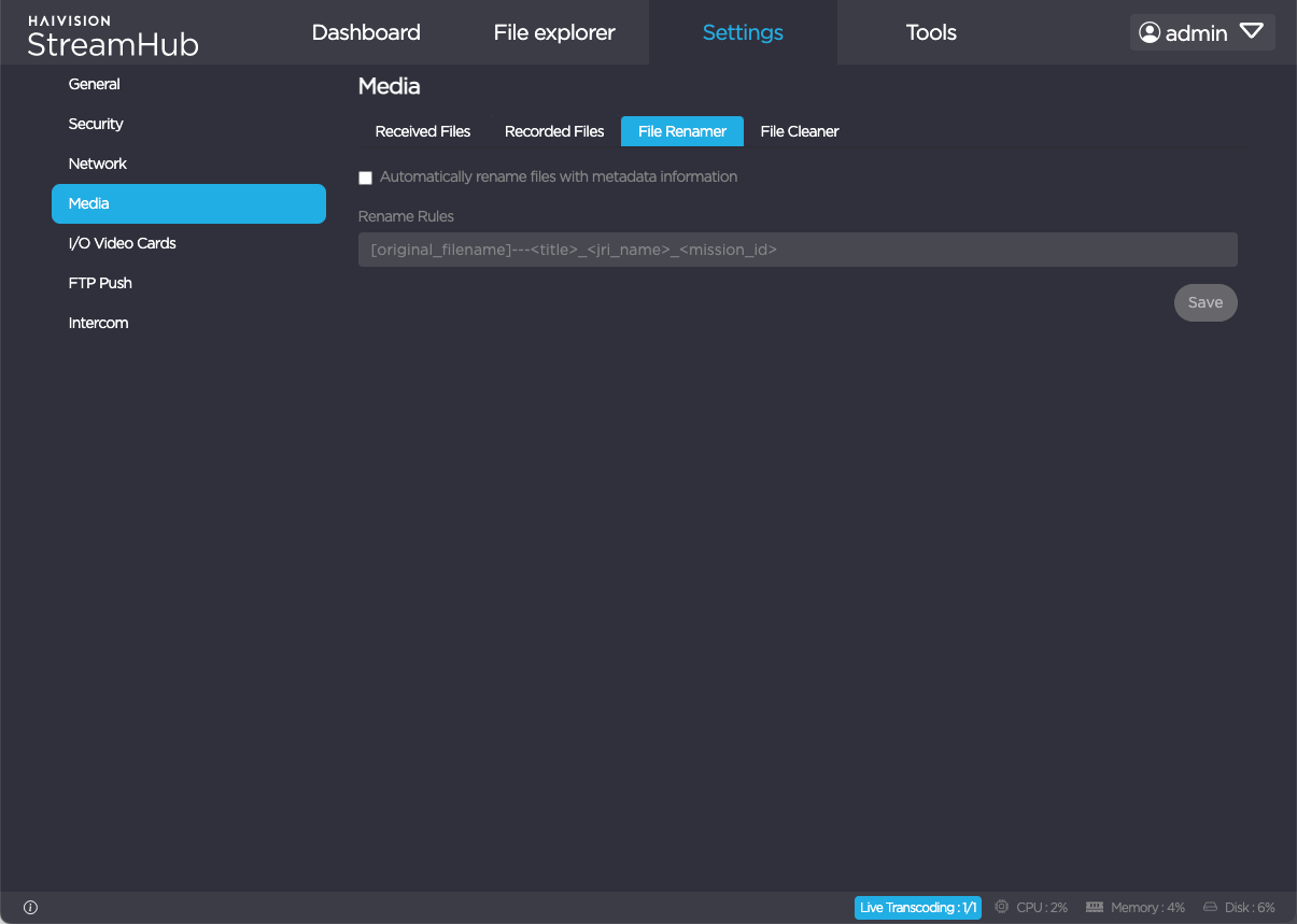 The Media menu allows you to manage files that StreamHub deals with. Tabs at the top of the screen give you access to the different options.
